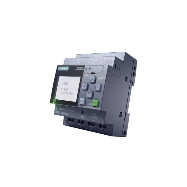 LOGO! 12/24RCE, logic module, display power supply / I/O: 12/ 24 V DC/relay, 8 DI 4 AI/4 DO, memory 400 blocks, modularly expandable, Ethernet, integrated web server, data log, user-defined web pages, standard microSD card for LOGO! Soft Comfort V8.4 or higher, older projects executable cloud connection, MQTT in all LOGO! 8.4 basic units