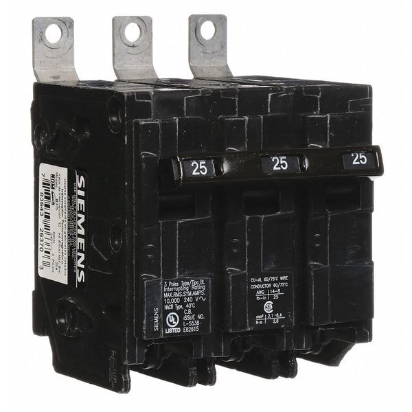 Miniature Circuit Breaker, Amps 25 A, AC Voltage Rating 240V AC, Circuit Breaker Type Standard, Number of Poles 3, DC Voltage Rating Not Rated, Circuit Breaker Actuator Toggle, Circuit Breaker Mounting Style Bolt On, Compatible Panelboard/Load Center Series P1, Phase Three, Series BL, Max. AIR Rating 10kA at 240V AC, For Use With Siemens P1 Panelboards, Terminal Connection Lug, Frame Size 125A/BL, Length 3.7 in, Width 4.4 in, Depth 12.8 in, Min. Wire Size 12 AWG (Al), 14 AWG (Cu)
