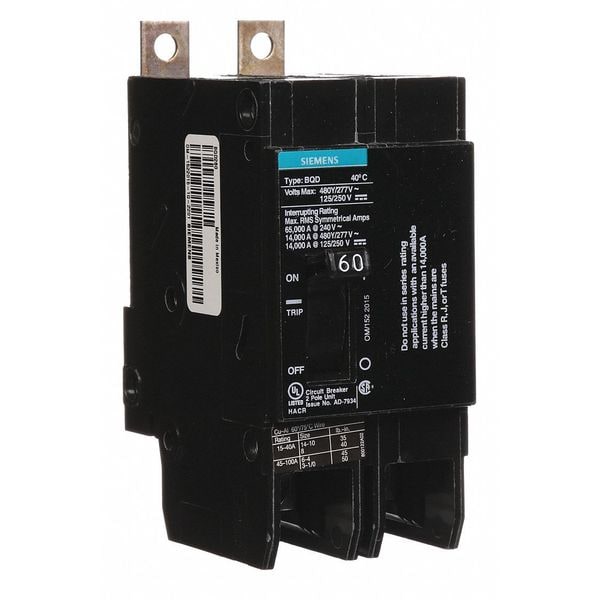Miniature Circuit Breaker, Amps 60 A, AC Voltage Rating 480V AC, Circuit Breaker Type Standard, Number of Poles 2, DC Voltage Rating 125/250V DC, Circuit Breaker Actuator Toggle, Circuit Breaker Mounting Style Bolt On, Compatible Panelboard/Load Center Series P1, Phase Single, Series BQD, Max. AIR Rating 14kA at 480V AC, For Use With Siemens P1 Panelboards, Terminal Connection Lug, Frame Size 100A/BQD, Length 4.49 in, Width 2 in, Depth 2.7 in, Max. Operating Temp. 104 Degrees F