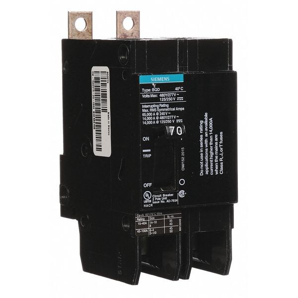 Miniature Circuit Breaker, Amps 70 A, AC Voltage Rating 480V AC, Circuit Breaker Type Standard, Number of Poles 2, DC Voltage Rating 125/250V DC, Circuit Breaker Actuator Toggle, Circuit Breaker Mounting Style Bolt On, Compatible Panelboard/Load Center Series P1, Phase Single, Series BQD, Max. AIR Rating 14kA at 480V AC, For Use With Siemens P1 Panelboards, Terminal Connection Lug, Frame Size 100A/BQD, Length 4.49 in, Width 2 in, Depth 2.7 in, Max. Operating Temp. 104 Degrees F