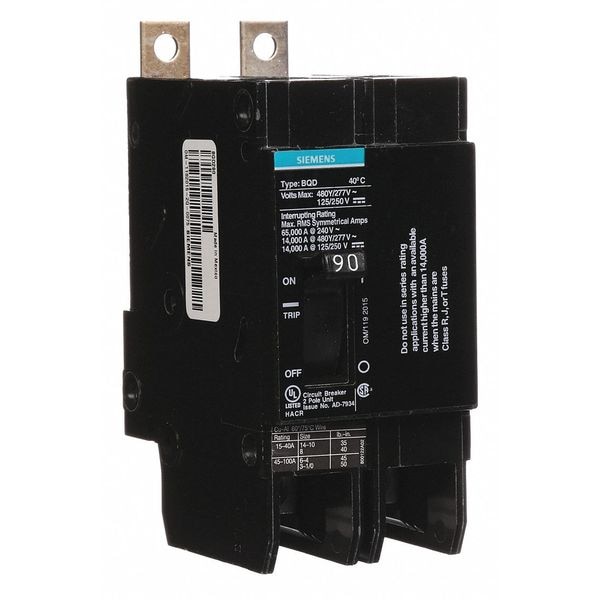 Miniature Circuit Breaker, Amps 90 A, AC Voltage Rating 480V AC, Circuit Breaker Type Standard, Number of Poles 2, DC Voltage Rating 125/250V DC, Circuit Breaker Actuator Toggle, Circuit Breaker Mounting Style Bolt On, Compatible Panelboard/Load Center Series P1, Phase Single, Series BQD, Max. AIR Rating 14kA at 480V AC, For Use With Siemens P1 Panelboards, Terminal Connection Lug, Frame Size 100A/BQD, Length 4.49 in, Width 2 in, Depth 2.7 in, Max. Operating Temp. 104 Degrees F