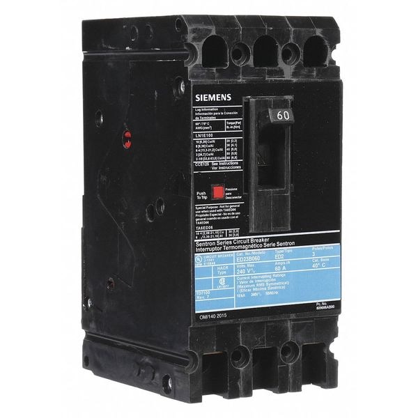 Molded Case Circuit Breaker, 60 A Amps, AC Voltage Rating 240V AC, Max. AIR Rating 10kA at 240V AC, For Use With SB Switchboards, Sentron Panelboards, Series ED2, High Amp Trip Setting 60 A, Low Amp Trip Setting 60 A, Circuit Breaker Type Standard, Number of Poles 3, DC Voltage Rating Not Rated, Terminal Connection Load Side Lug, Trip Type Thermal Magnetic, Phase Three, Instantaneous Trip Fixed, Phase Connection ABC, Frame Size 125A/ED, Circuit Breaker Mounting Style Lug In Panelboard
