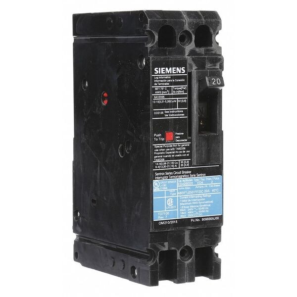 Molded Case Circuit Breaker, 20 A Amps, AC Voltage Rating 480V AC, Max. AIR Rating 18kA at 480V AC, For Use With SB Switchboards, Sentron Panelboards, Series ED4, High Amp Trip Setting 20 A, Low Amp Trip Setting 20 A, Circuit Breaker Type Standard, Number of Poles 2, DC Voltage Rating 250V DC, Terminal Connection Load Side Lug, Trip Type Thermal Magnetic, Phase Single, Instantaneous Trip Fixed, Phase Connection Any, Frame Size 125A/ED, Circuit Breaker Mounting Style Lug In Panelboard