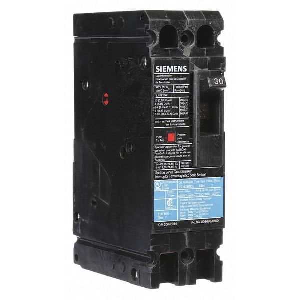 Molded Case Circuit Breaker, 30 A Amps, AC Voltage Rating 480V AC, Max. AIR Rating 18kA at 480V AC, For Use With SB Switchboards, Sentron Panelboards, Series ED4, High Amp Trip Setting 30 A, Low Amp Trip Setting 30 A, Circuit Breaker Type Standard, Number of Poles 2, DC Voltage Rating 250V DC, Terminal Connection Load Side Lug, Trip Type Thermal Magnetic, Phase Single, Instantaneous Trip Fixed, Phase Connection Any, Frame Size 125A/ED, Circuit Breaker Mounting Style Lug In Panelboard