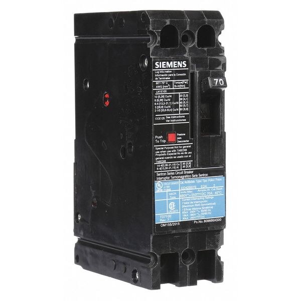 Molded Case Circuit Breaker, 70 A Amps, AC Voltage Rating 480V AC, Max. AIR Rating 18kA at 480V AC, For Use With SB Switchboards, Sentron Panelboards, Series ED4, High Amp Trip Setting 70 A, Low Amp Trip Setting 70 A, Circuit Breaker Type Standard, Number of Poles 2, DC Voltage Rating 250V DC, Terminal Connection Load Side Lug, Trip Type Thermal Magnetic, Phase Single, Instantaneous Trip Fixed, Phase Connection Any, Frame Size 125A/ED, Circuit Breaker Mounting Style Lug In Panelboard
