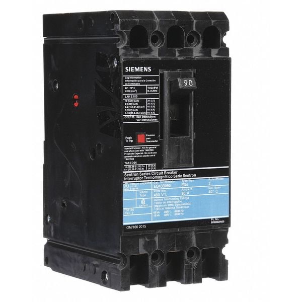 Molded Case Circuit Breaker, 90 A Amps, AC Voltage Rating 480V AC, Max. AIR Rating 18kA at 480V AC, For Use With SB Switchboards, Sentron Panelboards, Series ED4, High Amp Trip Setting 90 A, Low Amp Trip Setting 90 A, Circuit Breaker Type Standard, Number of Poles 3, DC Voltage Rating Not Rated, Terminal Connection Load Side Lug, Trip Type Thermal Magnetic, Phase Three, Instantaneous Trip Fixed, Phase Connection ABC, Frame Size 125A/ED, Circuit Breaker Mounting Style Lug In Panelboard