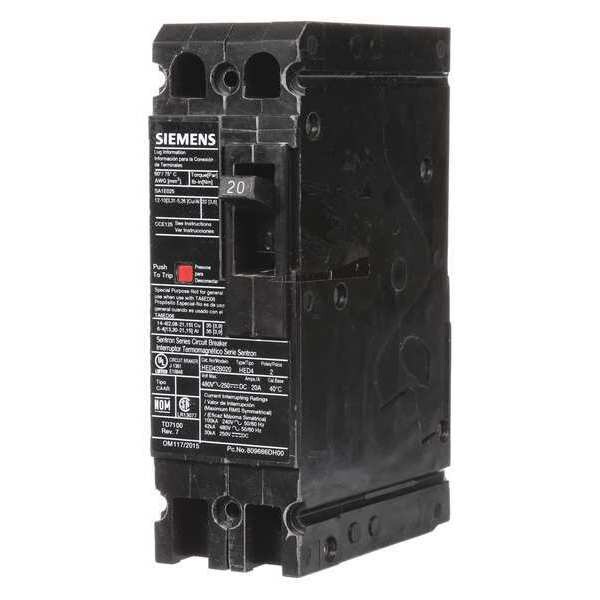 Molded Case Circuit Breaker, 20 A Amps, AC Voltage Rating 480V AC, Max. AIR Rating 42kA at 480V AC, For Use With SB Switchboards, Sentron Panelboards, Series HED4, High Amp Trip Setting 20 A, Low Amp Trip Setting 20 A, Circuit Breaker Type High Interrupting Capacity, Number of Poles 2, DC Voltage Rating 250V DC, Terminal Connection Load Side Lug, Trip Type Thermal Magnetic, Phase Single, Instantaneous Trip Fixed, Phase Connection Any, Frame Size 125A/ED