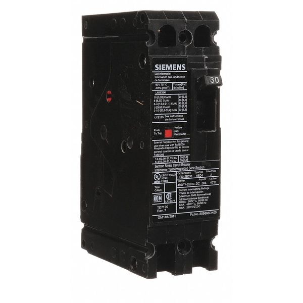 Molded Case Circuit Breaker, 30 A Amps, AC Voltage Rating 480V AC, Max. AIR Rating 42kA at 480V AC, For Use With SB Switchboards, Sentron Panelboards, Series HED4, High Amp Trip Setting 30 A, Low Amp Trip Setting 30 A, Circuit Breaker Type High Interrupting Capacity, Number of Poles 2, DC Voltage Rating 250V DC, Terminal Connection Load Side Lug, Trip Type Thermal Magnetic, Phase Single, Instantaneous Trip Fixed, Phase Connection Any, Frame Size 125A/ED