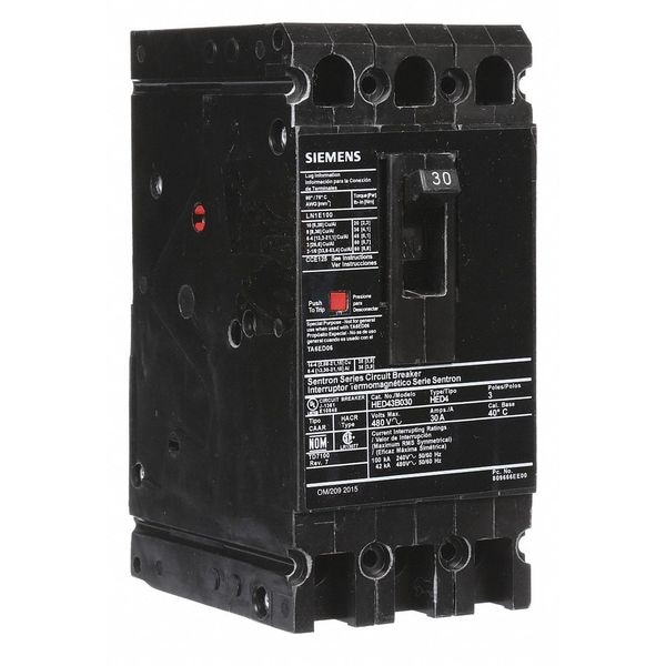 Molded Case Circuit Breaker, 30 A Amps, AC Voltage Rating 480V AC, Max. AIR Rating 42kA at 480V AC, For Use With SB Switchboards, Sentron Panelboards, Series HED4, High Amp Trip Setting 30 A, Low Amp Trip Setting 30 A, Circuit Breaker Type High Interrupting Capacity, Number of Poles 3, DC Voltage Rating Not Rated, Terminal Connection Load Side Lug, Trip Type Thermal Magnetic, Phase Three, Instantaneous Trip Fixed, Phase Connection ABC, Frame Size 125A/ED