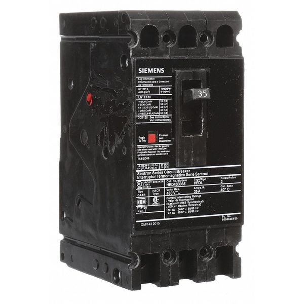 Molded Case Circuit Breaker, 35 A Amps, AC Voltage Rating 480V AC, Max. AIR Rating 42kA at 480V AC, For Use With SB Switchboards, Sentron Panelboards, Series HED4, High Amp Trip Setting 35 A, Low Amp Trip Setting 35 A, Circuit Breaker Type Standard, Number of Poles 3, DC Voltage Rating Not Rated, Terminal Connection Load Side Lug, Trip Type Thermal Magnetic, Phase Three, Instantaneous Trip Fixed, Phase Connection ABC, Frame Size 125A/ED, Circuit Breaker Mounting Style Lug In Panelboard