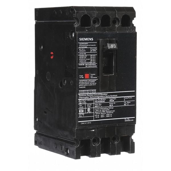 Molded Case Circuit Breaker, 40 A Amps, AC Voltage Rating 480V AC, Max. AIR Rating 42kA at 480V AC, For Use With SB Switchboards, Sentron Panelboards, Series HED4, High Amp Trip Setting 40 A, Low Amp Trip Setting 40 A, Circuit Breaker Type High Interrupting Capacity, Number of Poles 3, DC Voltage Rating Not Rated, Terminal Connection Load Side Lug, Trip Type Thermal Magnetic, Phase Three, Instantaneous Trip Fixed, Phase Connection ABC, Frame Size 125A/ED