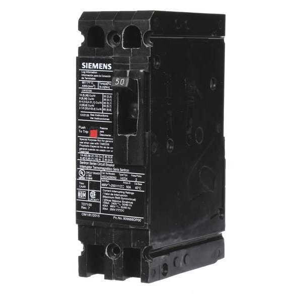 Molded Case Circuit Breaker, 50 A Amps, AC Voltage Rating 480V AC, Max. AIR Rating 42kA at 480V AC, For Use With SB Switchboards, Sentron Panelboards, Series HED4, High Amp Trip Setting 50 A, Low Amp Trip Setting 50 A, Circuit Breaker Type High Interrupting Capacity, Number of Poles 2, DC Voltage Rating 250V DC, Terminal Connection Load Side Lug, Trip Type Thermal Magnetic, Phase Single, Instantaneous Trip Fixed, Phase Connection Any, Frame Size 125A/ED