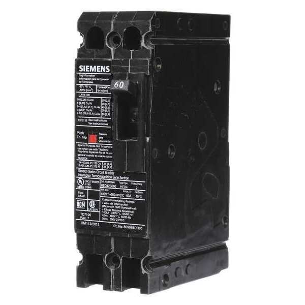 Molded Case Circuit Breaker, 60 A Amps, AC Voltage Rating 480V AC, Max. AIR Rating 42kA at 480V AC, For Use With SB Switchboards, Sentron Panelboards, Series HED4, High Amp Trip Setting 60 A, Low Amp Trip Setting 60 A, Circuit Breaker Type High Interrupting Capacity, Number of Poles 2, DC Voltage Rating 250V DC, Terminal Connection Load Side Lug, Trip Type Thermal Magnetic, Phase Single, Instantaneous Trip Fixed, Phase Connection Any, Frame Size 125A/ED