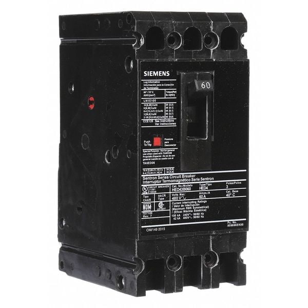 Molded Case Circuit Breaker, 60 A Amps, AC Voltage Rating 480V AC, Max. AIR Rating 42kA at 480V AC, For Use With SB Switchboards, Sentron Panelboards, Series HED4, High Amp Trip Setting 60 A, Low Amp Trip Setting 60 A, Circuit Breaker Type High Interrupting Capacity, Number of Poles 3, DC Voltage Rating Not Rated, Terminal Connection Load Side Lug, Trip Type Thermal Magnetic, Phase Three, Instantaneous Trip Fixed, Phase Connection ABC, Frame Size 125A/ED