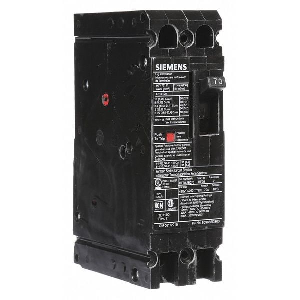 Molded Case Circuit Breaker, 70 A Amps, AC Voltage Rating 480V AC, Max. AIR Rating 42kA at 480V AC, For Use With SB Switchboards, Sentron Panelboards, Series HED4, High Amp Trip Setting 70 A, Low Amp Trip Setting 70 A, Circuit Breaker Type High Interrupting Capacity, Number of Poles 2, DC Voltage Rating 250V DC, Terminal Connection Load Side Lug, Trip Type Thermal Magnetic, Phase Single, Instantaneous Trip Fixed, Phase Connection Any, Frame Size 125A/ED