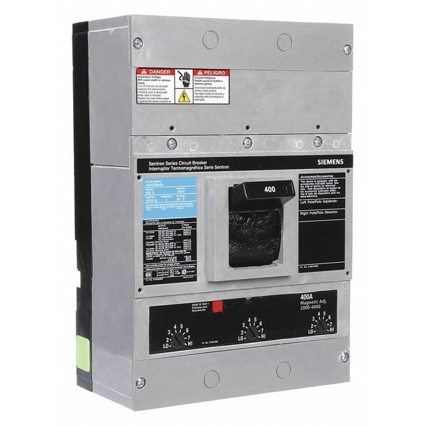 Molded Case Circuit Breaker, 400 A Amps, AC Voltage Rating 240V AC, Max. AIR Rating 65kA at 240V AC, For Use With SB Switchboards Without Lugs, Sentron Panelboards, Series JXD2-A, High Amp Trip Setting 400 A, Low Amp Trip Setting 400 A, Circuit Breaker Type Standard, Number of Poles 3, DC Voltage Rating Not Rated, Terminal Connection Lug, Trip Type Thermal Magnetic, Phase Three, Instantaneous Trip Fixed, Phase Connection ABC, Frame Size 400A/JD