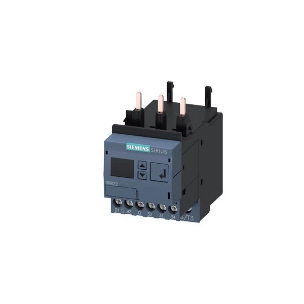 Monitoring relay, can be mounted to Contactor 3RT2, Size S0 standard, digitally adjustable Apparant/active current monitoring 4...40 A, 20...400 Hz, 3-phase Supply 24 V AC/DC 1 change-over contact, 1 semiconductor output for alarm and warning Monitoring for Current overshoot and undershoot Phase failure, Cable break Phase sequence Residual current Blocking current Warning and alarm thresholds with or without fault buffer ON delay 0-99 s Noise pulse suppression 0-30 s Pause after fault 0-300 min Screw connection system