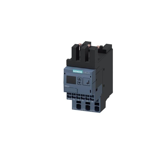 Monitoring relay, can be mounted to Contactor 3RT2, Size S0 standard, digitally adjustable Apparant/active current monitoring 4...40 A, 20...400 Hz, 3-phase Supply 24 V AC/DC 1 change-over contact, 1 semiconductor output for alarm and warning Monitoring for Current overshoot and undershoot Phase failure, Cable break Phase sequence Residual current Blocking current Warning and alarm thresholds with or without fault buffer ON delay 0-99 s Noise pulse suppression 0-30 s Pause after fault 0-300 min spring-type connection system