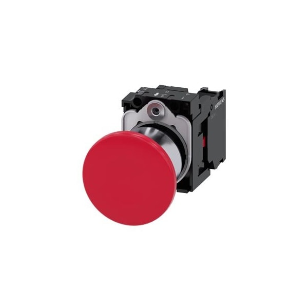 Mushroom pushbutton, 22 mm, round, metal, shiny, red, 40mm, latching, pull-to-unlatch mechanism, with holder, 1 NC, screw terminal, with laser labeling, lower case