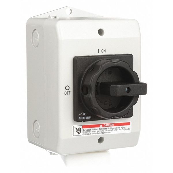 Safety Switch, Contact Form 3PST, Current Rating 30 A, Depth 4 5/8 in, Duty Heavy Duty, Enclosure Type Enclosed, Environment Indoor/Outdoor, For Fuse Class Not Applicable, Handle Color Black, Handle Type Rotary, Height 6 1/2 in, Horsepower @ 600V AC 20 hp, Housing Material Plastic, IP Rating IP65, NEMA Enclosure Rating 1, 12, 4X, Neutral Assembly Included No