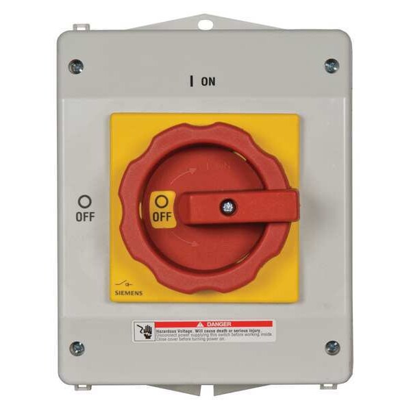 Safety Switch, Contact Form 3PST, Current Rating 63 A, Depth 5 7/8 in, Duty Heavy Duty, Enclosure Type Enclosed, Environment Indoor/Outdoor, For Fuse Class Not Applicable, Handle Color Black, Handle Type Rotary, Height 7 7/8 in, Horsepower @ 600V AC 50 hp, Housing Material Plastic, IP Rating IP65, NEMA Enclosure Rating 1, 12, 4X, Neutral Assembly Included No