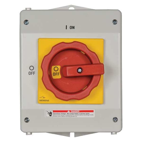 Safety Switch, Contact Form 3PST, Current Rating 63 A, Depth 5 7/8 in, Duty Heavy Duty, Enclosure Type Enclosed, Environment Indoor/Outdoor, For Fuse Class Not Applicable, Handle Color Red/Yellow, Handle Type Rotary, Height 7 7/8 in, Horsepower @ 600V AC 50 hp, Housing Material Plastic, IP Rating IP65, NEMA Enclosure Rating 1, 12, 4X, Neutral Assembly Included No