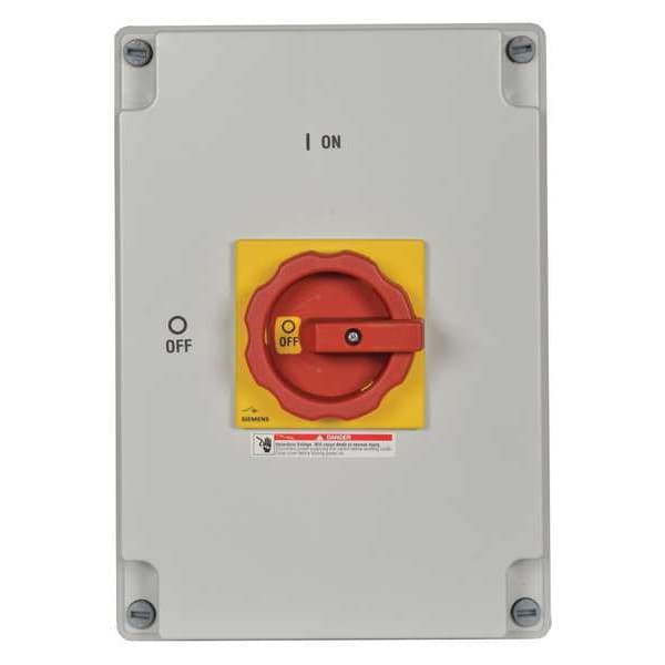 Safety Switch, Contact Form 3PST, Current Rating 100 A, Depth 4 5/8 in, Duty Heavy Duty, Enclosure Type Enclosed, Environment Indoor/Outdoor, For Fuse Class Not Applicable, Handle Color Red/Yellow, Handle Type Rotary, Height 11 7/8 in, Horsepower @ 600V AC 75 hp, Housing Material Plastic, IP Rating IP65, NEMA Enclosure Rating 1, 12, 4X, Neutral Assembly Included Yes
