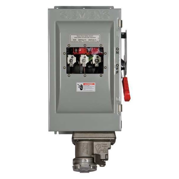 Safety Switch, Contact Form 3PST, Current Rating 60 A, Depth 8 3/8 in, Duty Heavy Duty, Enclosure Type Enclosed, Environment Indoor, Features Crouse-Hinds Arktite(R) Compatible Receptacle, Viewing Window, For Fuse Class Not Applicable, Height 17 1/2 in, Horsepower @ 600V AC 60 hp, Housing Material Steel, Includes Interlocked Receptacle Yes, IP Rating IP20, Mounting Style Surface Mount, NEMA Enclosure Rating 12