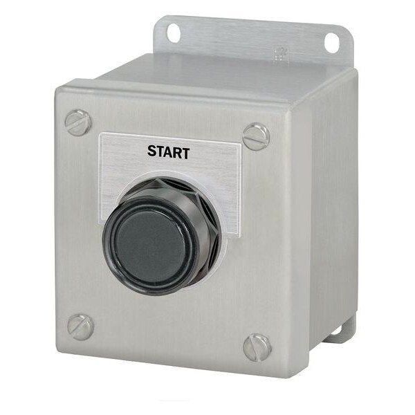 Control Station, Number of Operators 1, Number of Pilot Lights 0, Size 30 mm, Legend Start, Type of Operator Flush Button, Action Momentary, Operator Color (2) Black, Contact Form 1NO/1NC, Mechanical Interlock No, NEMA Rating 4X, Contact Rating 5A @ 600V AC, NEMA Contact Rating Designation B600, IP Rating IP66, Mounting Wall, Height 3.81 in, Width 3.47 in, Depth 4.5 in, Enclosure Material Stainless Steel, Enclosure Color Gray, Standards CSA LR6535, UL E22655