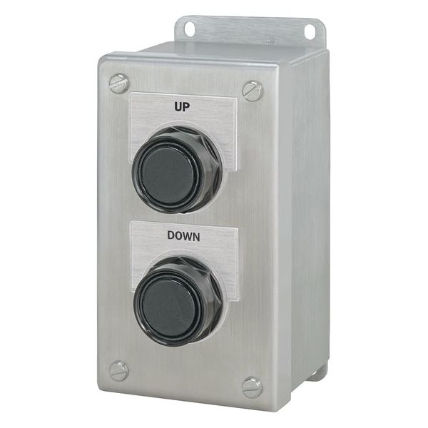 Control Station, Number of Operators 2, Number of Pilot Lights 0, Size 30 mm, Legend Up/Down, Type of Operator Flush Button/Flush Button, Action Momentary/Momentary, Operator Color (2) Black, Contact Form 2NO/2NC, Mechanical Interlock No, NEMA Rating 4X, Contact Rating 5A @ 600V AC, NEMA Contact Rating Designation B600, IP Rating IP66, Mounting Wall, Height 3.81 in, Width 3.47 in, Depth 6.75 in, Enclosure Material Stainless Steel, Enclosure Color Gray, Standards CSA LR6535, UL E22655