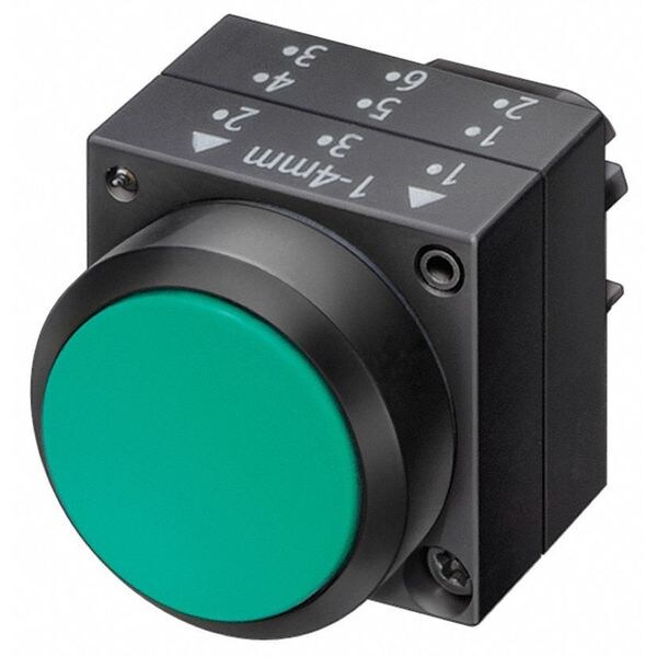 Flush Push Button, 22 mm, Momentary, Type of Operator Flush Button, Basic Material Plastic, Head Material Polycarbonate Plastic, Bezel Material Plastic, Color Green, NEMA Rating 1, 12, 3, 4, 4X, IP Rating IP66, Standards CE, CSA, UL Listed