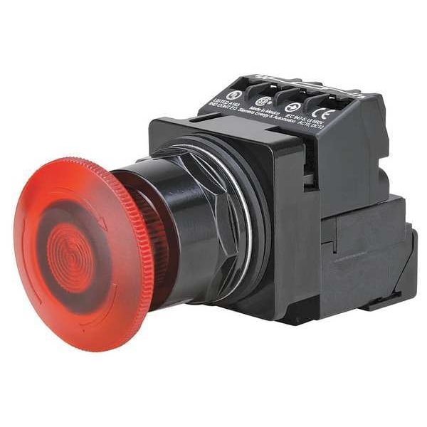 Mushroom Head Push Button, 30 mm, Maintained Action, 45mm Mushroom Head Type of Operator, Head Material Plastic, Contact Form 1NO/1NC, Bezel Black Epoxy Coated Zinc Die Cast, Color Red, Contact Rating 10A @ 600V AC, NEMA Contact Rating Designation A600/P600, Number of Operators 1, NEMA Rating 1, 12, 13, 3, 3R, 4, 4X, IP Rating IP20, IP66, Legend Not Applicable, Standards CSA, REACH, UL Listed, Terminal Connection Screw