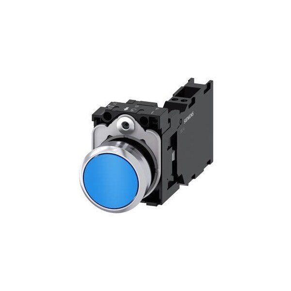 Pushbutton, 22 mm, round, metal, shiny, blue, pushbutton, flat, momentary contact type, 1 NO+1 NC, Spring-type terminal