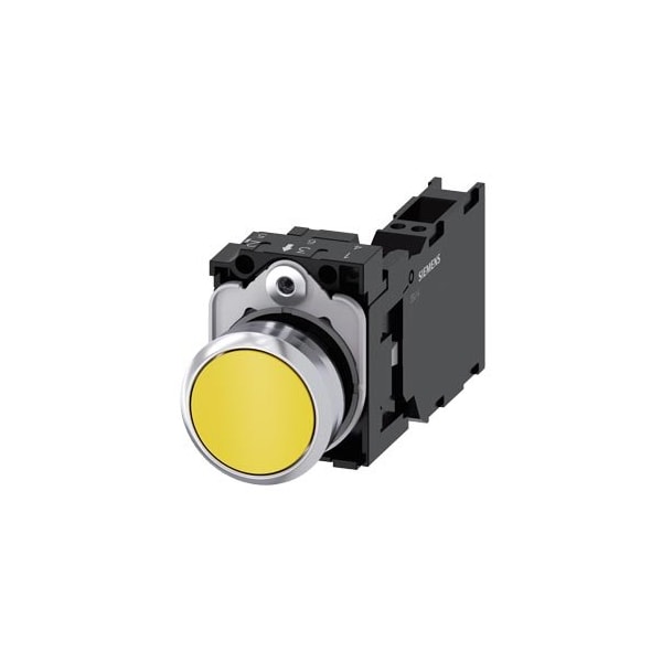 Pushbutton, 22 mm, round, metal, shiny, yellow, pushbutton, flat, momentary contact type, 1 NO+1 NC, Spring-type terminal