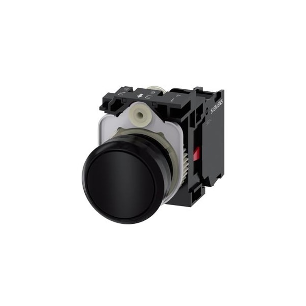 Pushbutton, 22 mm, round, plastic, black, pushbutton, flat, momentary contact type, with holder 1 NC, screw terminal