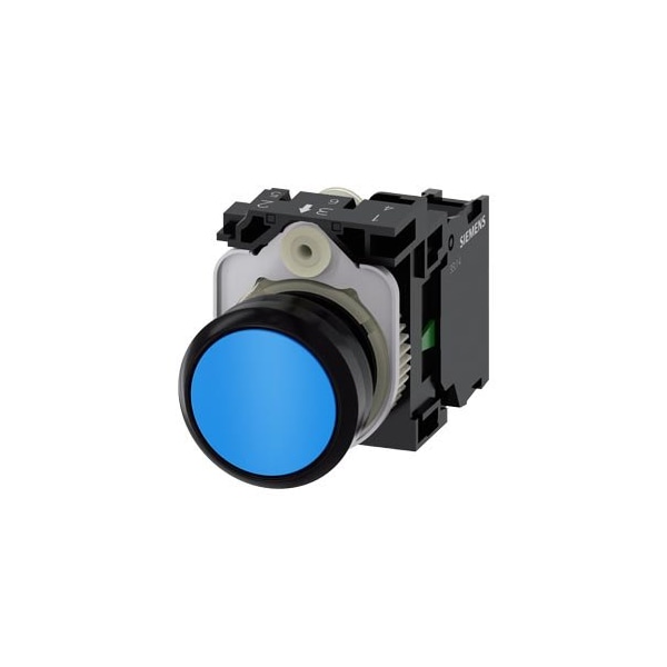 Pushbutton, 22 mm, round, plastic, blue, pushbutton, flat, momentary contact type, with holder 1 NO, screw terminal, with laser labeling, upper case and lower case, always upper case at the beginning of the word