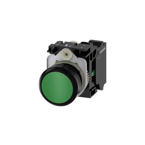 Pushbutton, 22 mm, round, plastic, green, pushbutton, flat, momentary contact type, with holder 1 NO, spring-type terminal, with laser labeling, lower case