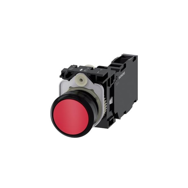 Pushbutton, 22 mm, round, plastic, red, pushbutton, flat, momentary contact type, with holder 1 NO+1 NC, screw terminal, with laser labeling, upper case and lower case, always upper case at beginning of line