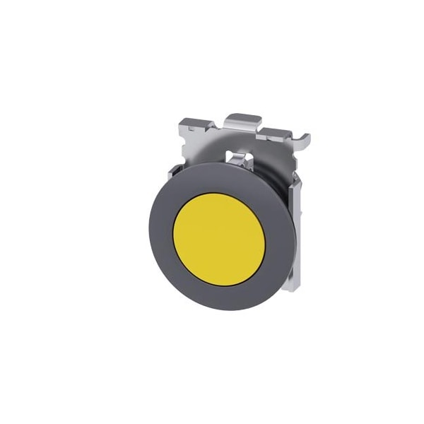 Pushbutton, 30 mm, round, Metal, matte, yellow, front ring for flush installation, latching, Push-to-release mechanism, with laser labeling, symbol number according to, ISO 7000 or IEC 60417
