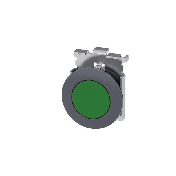 Pushbutton, 30 mm, round, metal, matte, green, front ring for flush installation, latching, Push-to-release mechanism