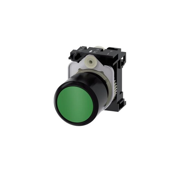 Pushbutton, compact, with extended stroke 12 mm, 22 mm, round, plastic, green, pushbutton, flat, momentary contact type, with holder, with laser labeling, upper case and lower case, always upper case at beginning of line