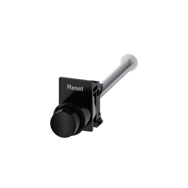 Pushbutton, compact, with extended stroke 12 mm, 22 mm, round, plastic, black, pushbutton, raised, momentary contact type, with holder, with extension plunger, with label holder, Frame bottom square, with labeling plate 12.5 mm x 27 mm, black, with inscription: Reset