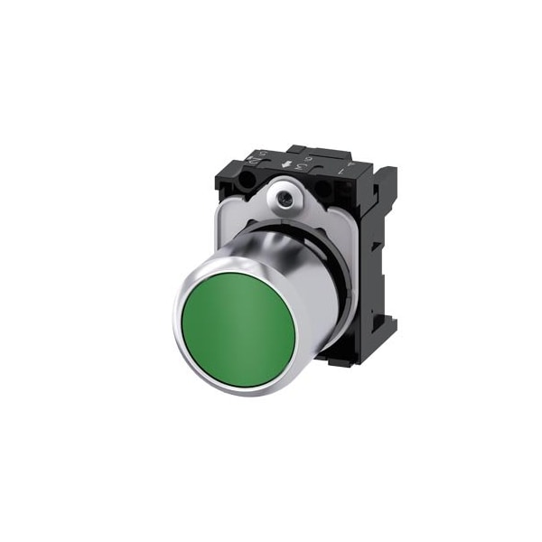 Pushbutton, compact, with extended stroke 12 mm, 22 mm, round, Metal, green, pushbutton, flat, momentary contact type, with holder, with laser labeling, upper case