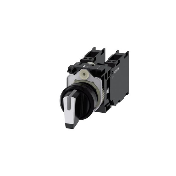 Selector switch, illuminable, 22 mm, round, plastic, white, selector switch, short, 3 switch positions I-O-II, latching, 10:30h/12h/13:30h, with holder, 2x1NO+1NC, Spring-type terminal