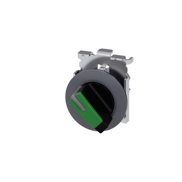 Selector switch, illuminable, 30 mm, round, Metal, matte, green, selector switch, short, front ring for flush installation, 2 switch positions OI, momentary contact type, Actuating angle 45°, 10:30h/12h, with laser labeling, inscription or symbol Customer-specific selection with SIRIUS ACT configurator CIN