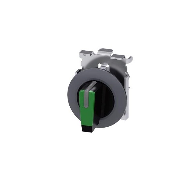 Selector switch, illuminable, 30 mm, round, Metal, matte, green, selector switch, short, front ring for flush installation, 3 switch positions I-O-II, latching, actuating angle 2x45°, 10:30h/12h/13:30h, with laser labeling, upper case