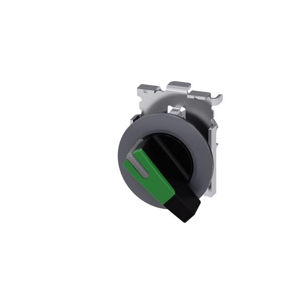 Selector switch, illuminable, 30 mm, round, Metal, matte, green, selector switch, long, front ring for flush installation, 2 switch positions O-I, latching, actuating angle 90°, 10:30h/13:30h, with laser labeling, inscription or symbol Customer-specific selection with SIRIUS ACT configurator CIN