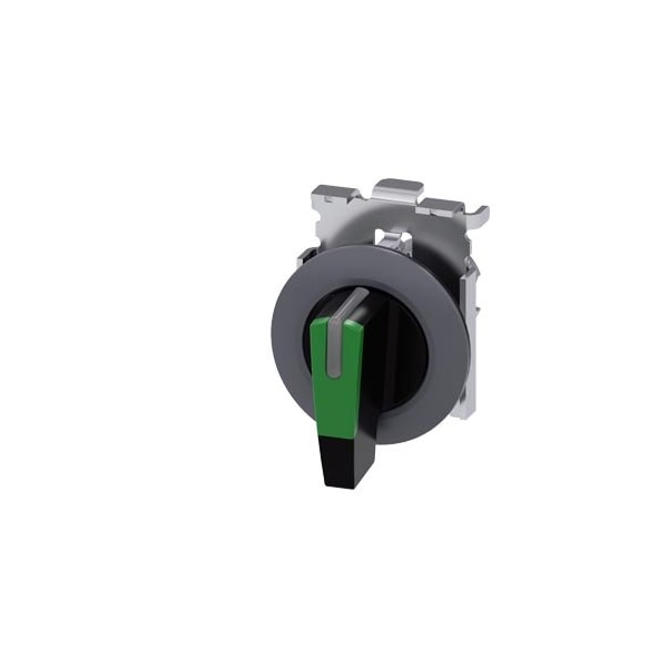 Selector switch, illuminable, 30 mm, round, Metal, matte, green, selector switch, long, front ring for flush installation, 3 switch positions I-O-II, latching, actuating angle 2x45°, 10:30h/12h/13:30h, with laser labeling, inscription or symbol Customer-specific selection with SIRIUS ACT configurator CIN