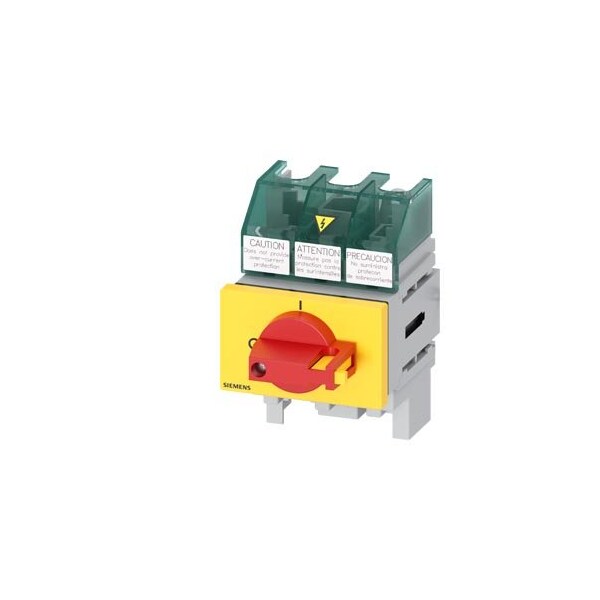 SENTRON, Molded case switch 3LD5 UL, Emergency switching-off, 3-pole, certified according to UL489 UL60947-4-1 and IEC60947-3, UL: 30A, SCCR 50kA at 480VAC, Operating power at 480VAC 3-phase: 20hp, IEC: 32A, Operating power at AC-23A at 400V: 15kW, floor mounting with direct handle, red/yellow, incl. terminal covers for the infeed side