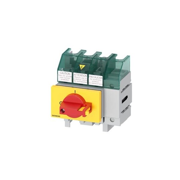 SENTRON, Molded case switch 3LD5 UL, Emergency switching-off, 4-pole, certified according to UL489 UL60947-4-1 and IEC60947-3, UL: 30A, SCCR 50kA at 480VAC, Operating power at 480VAC 3-phase: 20hp, IEC: 32A, Operating power at AC-23A at 400V: 15kW, floor mounting with direct handle, red/yellow, incl. terminal covers for the infeed side